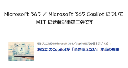 いずれにせよ、特に「 Work 」を選択すると Microsoft 365 の社内データのみを情報源にすると思っている人もいるでしょうし、その状態で「Web検索」をオフにすると Microsoft 365 の社内データのみを情報源にすると思っている人も多いと思いますが、実はちょっと違ったりするので、是非冒頭で紹介した過去記事をご参照ください。今回は小ネタでした。