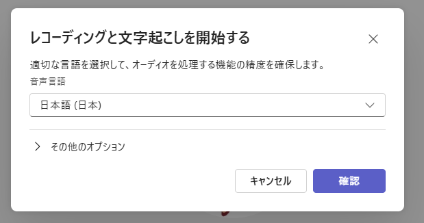 このアップデートはまず気付きにくい点が挙げられます。ここで「確認」をクリックしたら録画の方のレコーディングが開始されます。じゃ録音にしたい場合は?実は「その他のオプション」に隠れているんです。クリックすると、