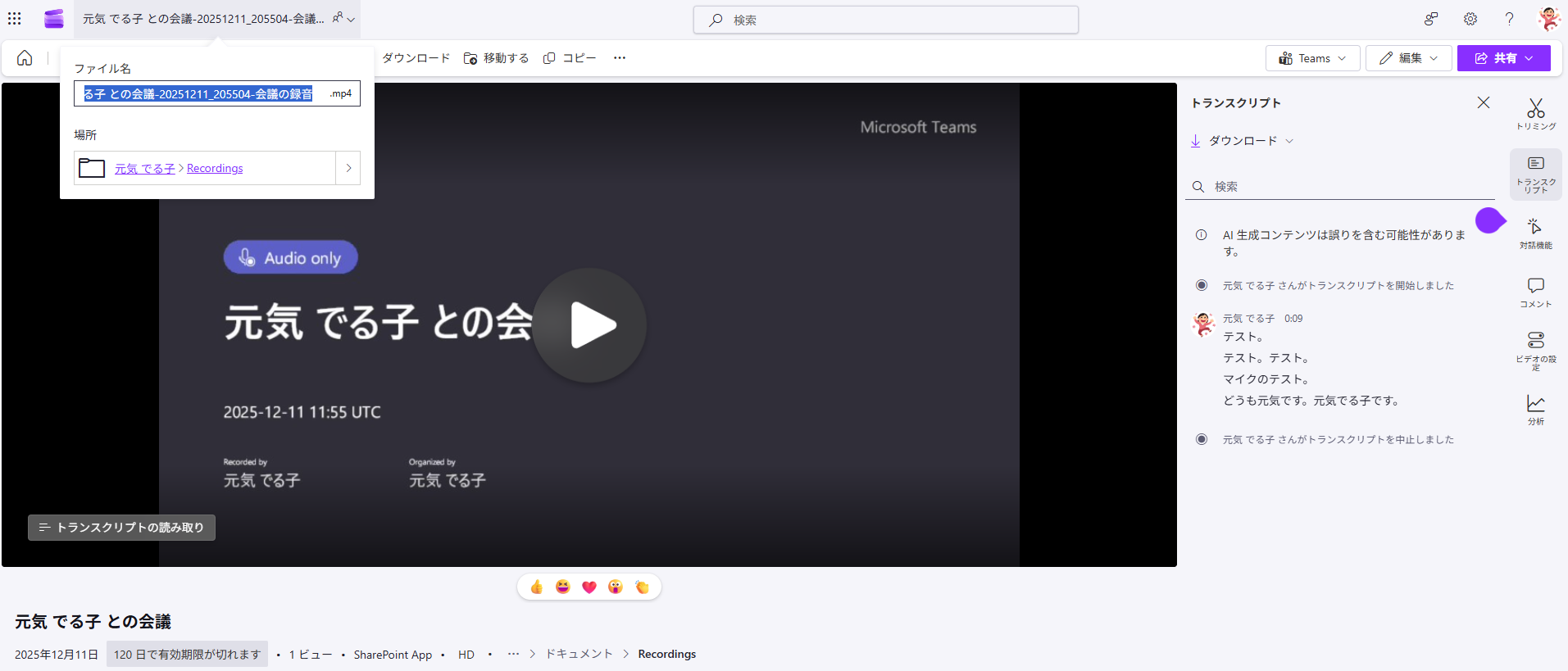 ▼音声のみの録音が Microsoft Teams で利用可能になりました