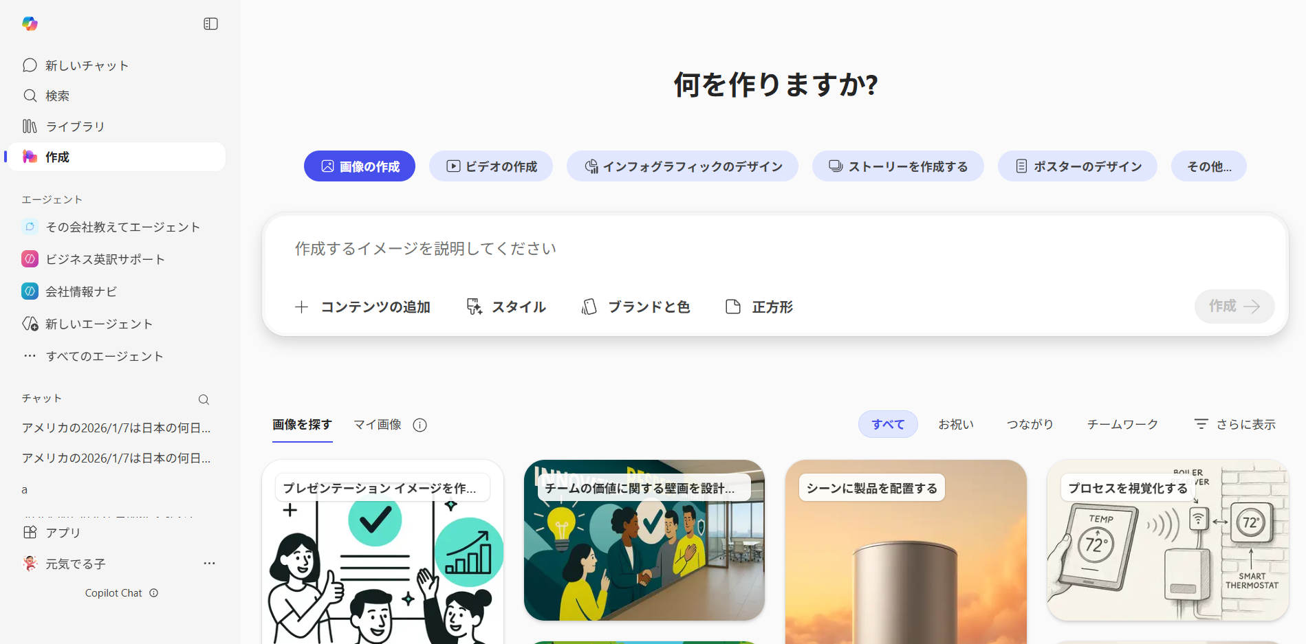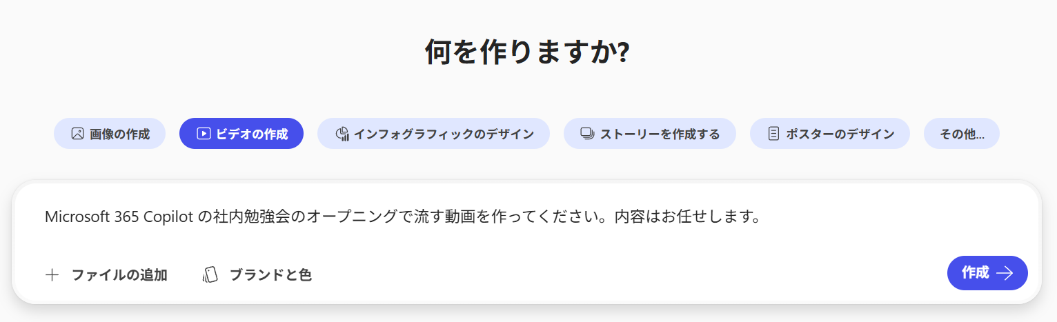左下に「 Copilot Chat 」って表示されている場合は Microsoft 365 Copilot がないユーザーの場合の表示ですね。現時点ではそのユーザーであっても「画像の作成」「ビデオの作成」が復活しました。