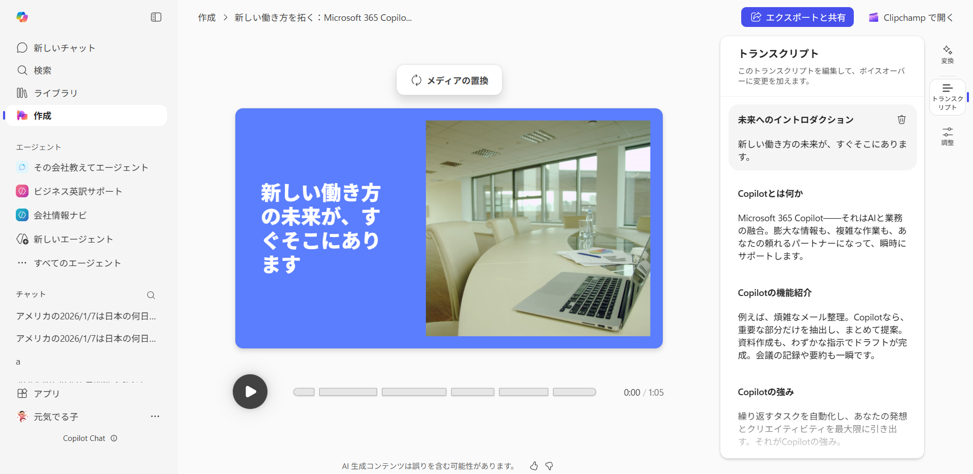 こちらも動画生成してくれる生成AIは他のモデルでもできますが、生成してくれた動画の簡単なトランスクリプトの編集などは人間の手作業でサクっと変更できるので、 Copilot と人間の共同作業が実現できます。また、更に動画編集したい場合は、 Microsoft 365 の動画アプリである Clipchamp でプロジェクトとして開くことができます。右上の「 Clipchamp で開く」をクリックすると、