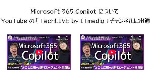 ITmedia さんの YouTube チャンネル「 TechLIVE by ITmedia 」に出演した2本の動画が公開されました。冒頭急にギター弾いたりトリッキーな事をしていますが、中身は真面目に Microsoft 365 Copilot の話をデモを中心にしています。
