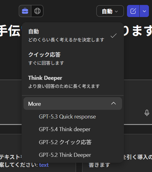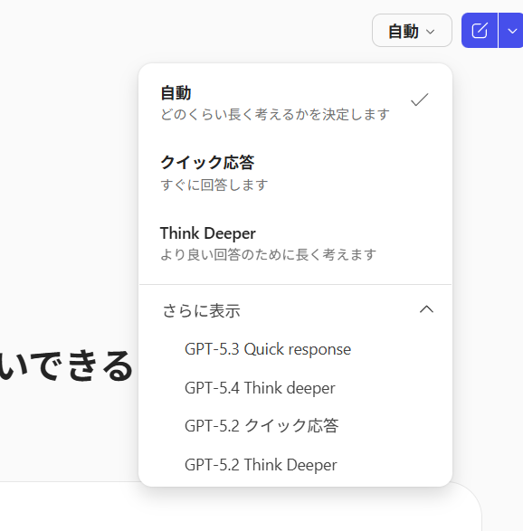 この時も「Quick Response」と「Think Deeper」の切り替え、もしくは既定の「自動」だったので、モデルの切り替えというわけではないので、おそらく「モデルセレクター」ではなく「モードセレクター」という名称なのかなと勝手に思っていますが。