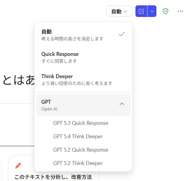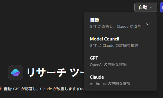 Microsoft 365 Copilot Chat やリサーチツールエージェント、 Copilot in Excel 、 Copilot in PowerPoint などには、画面右上に「自動」というボタンがあって、そこを展開させるとお好きな生成AIのモデルを選べる部分がありますよね。