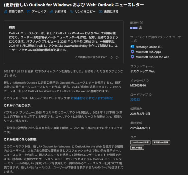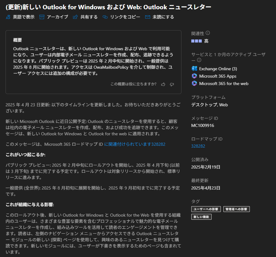 以下は Microsoft 365 管理センターのメッセージセンターに 2025/04/24 に公開されたメッセージです。