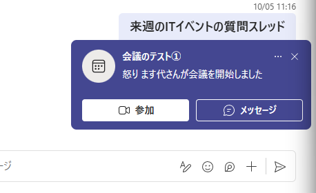 Microsoft Teams でスケジュールされた会議が開始されると(誰かが参加すると)トースト通知ボックスがこれまでは表示されて会議が始まった事に気が付きますよね。