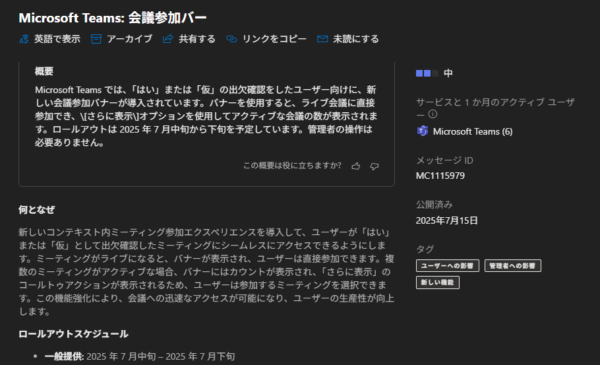 2025/07/15 付けで Microsoft 365 管理センターのメッセージセンターに以下のメッセージが公開されました。
