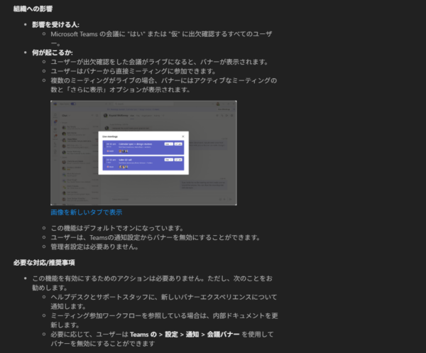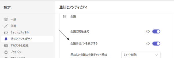 この「会議参加バーを表示する」をオフにすると表示されなくなるようです。そう、冒頭にメッセージセンターのメッセージ内では「バナー」と「バー」で表記揺れしているけど「バー」でしょう。という話をしましたが、実画面でここでは「会議参加バー」という記載を確認したので「バー」だと結論づけました。