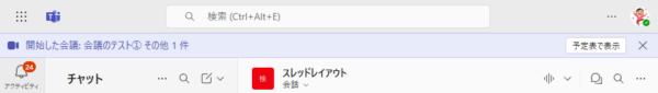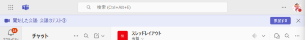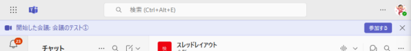 これはトースト通知ボックスと違って会議開催中はずっと表示されています。なのでこの存在さえ把握していれば、 Microsoft Teams さえ開いていればどの画面を開いても今現在自分が関係する会議が開催されているかどうかの確認ができますね。もちろん会議参加バーの右側の「参加する」ボタンから会議に参加する事ができます。