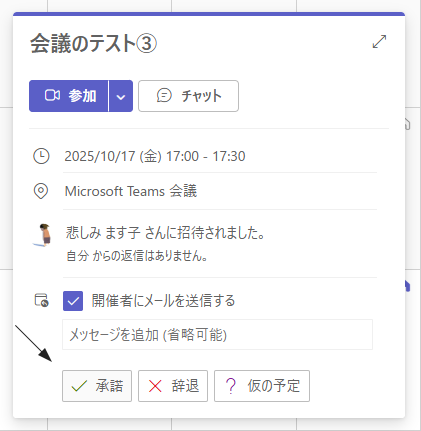 さて、メッセージセンターのメッセージ内では出欠確認で「はい」または「仮」にしたユーザー向けという記載がありました。でも実際に今試したのは出欠確認は特にリアクションしていない状態です。