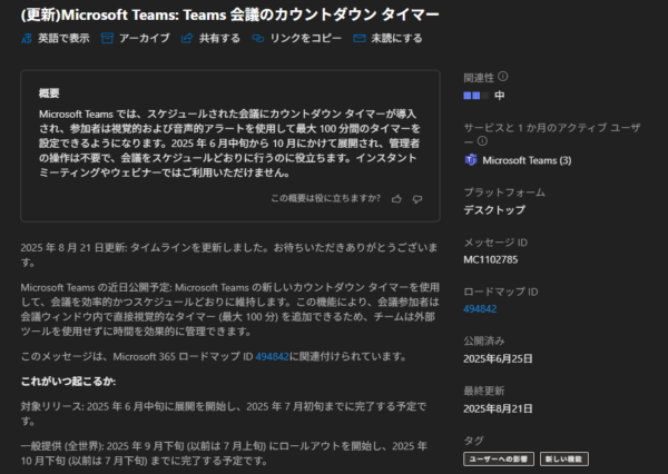 2025/06/25付けで Microsoft 365 管理センターのメッセージセンターに、以下のメッセージが公開されました。