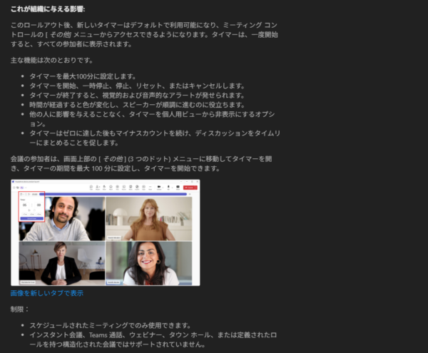 最大100分のタイマーが使用できるようです。オンライン会議に参加している全員が見る事ができるようです。ただし、スケジュールされた会議でのみ使用でき、インスタント会議や通話やウェビナー、タウンホールでは使えないようです。