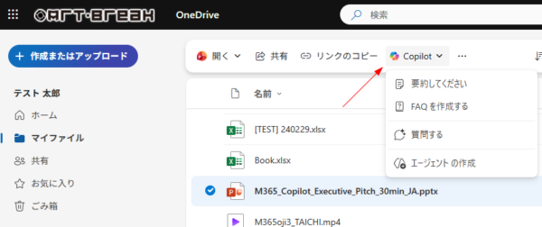 Microsoft 365 Copilot : OneDrive for Business で新たに Copilot ボタンが現れた