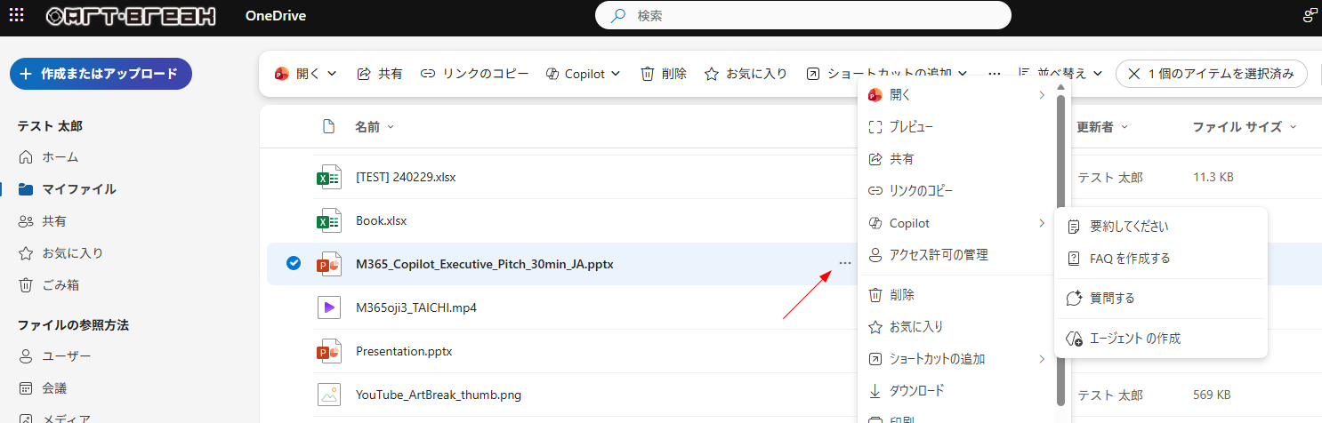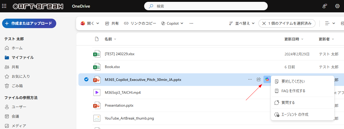 ▼ファイルを選択し、コマンドバーの「 Copilot 」からアクセス