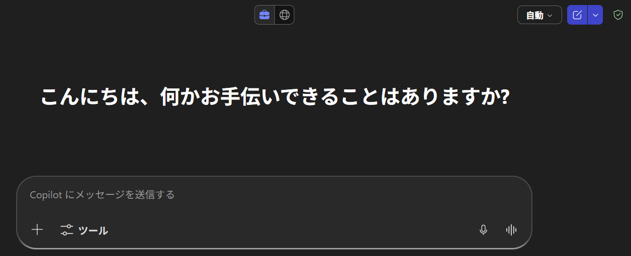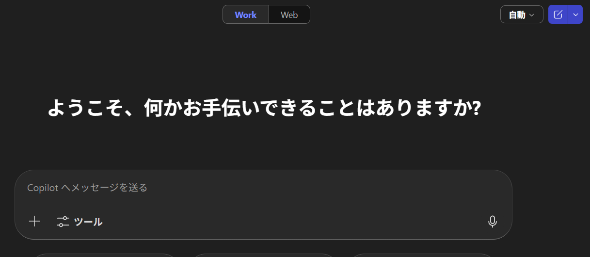M365 Copilot ライセンスユーザーには見慣れた画面ですね(ダークモードにしていますが)。このように上部の「 Work / Web 」の切り替えスイッチはテキストボタンです。以前は「 仕事 / Web 」でしたけどね。