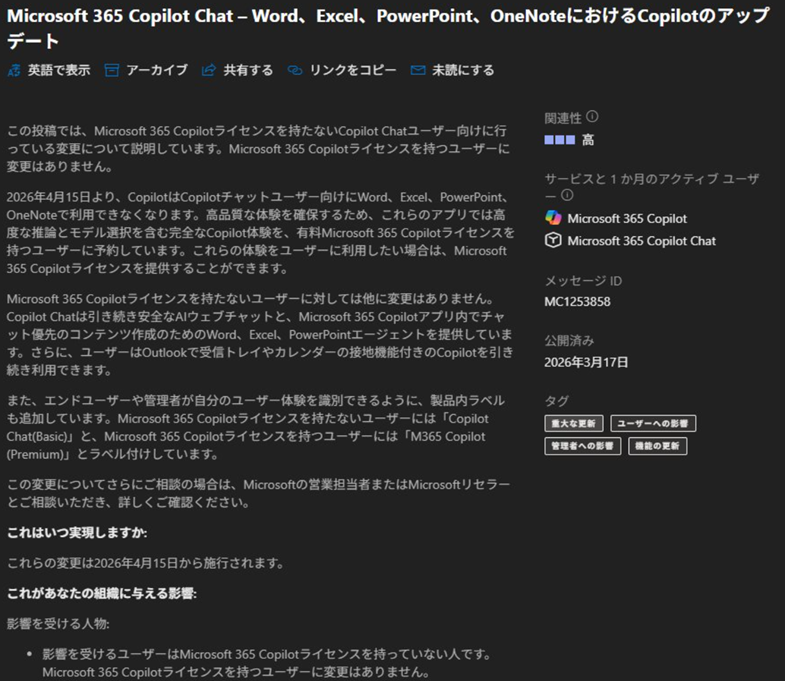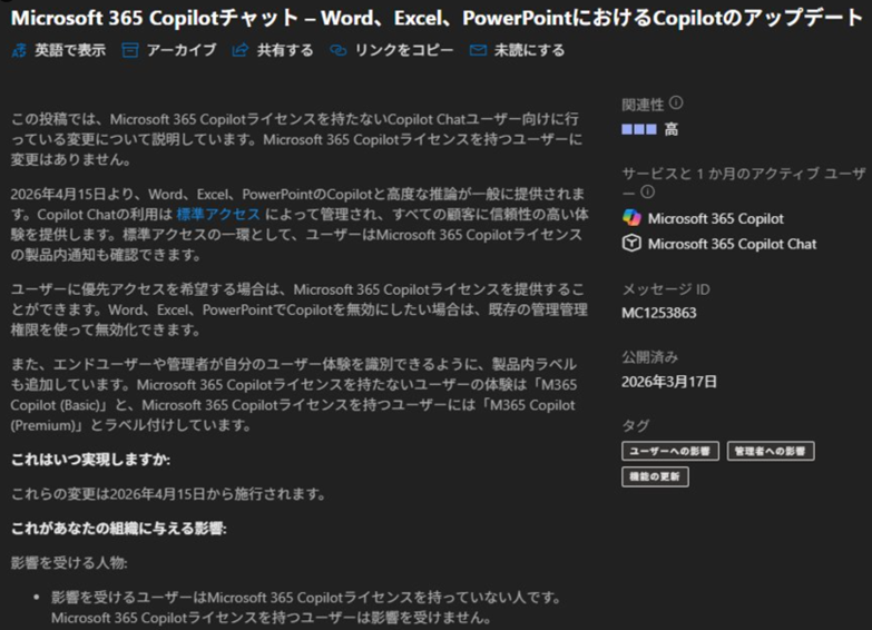 昨日からXで大きく話題になっている事ですが、 Microsoft 365 管理センターのメッセージセンターに MC1253858 か MC1253863 のどちらかのメッセージが公開されているハズです。僕の環境ではどちらも公開されていないテナントもありますが。