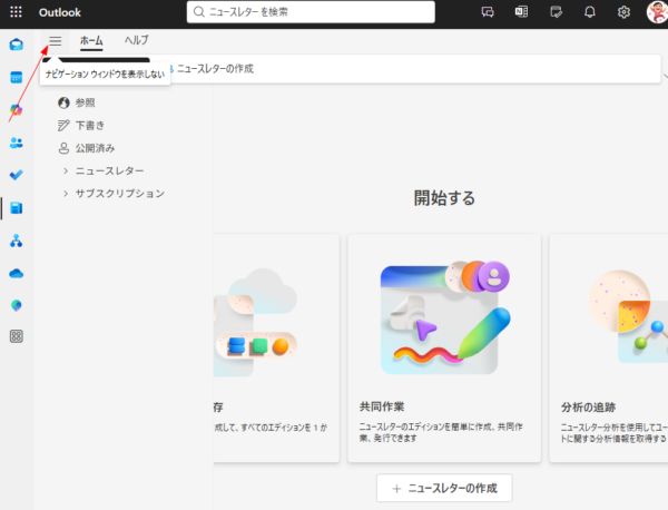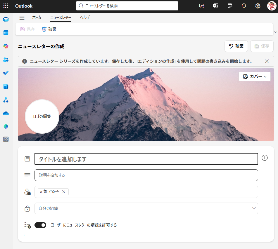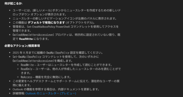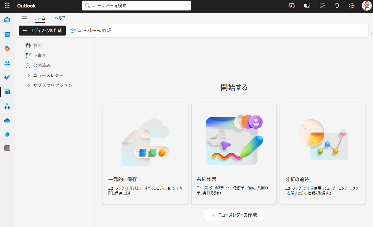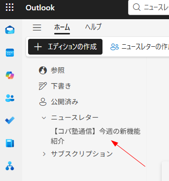 で、結果的に一般提供は2025年8月中旬~8月下旬となり、現時点ではすでに利用できる状況です。新機能として登場ですが、 Outlook でニュースレターという名前からなんとなく想像できますよね。では実際に触ってみたいと思います。環境は Outlook on the web です。