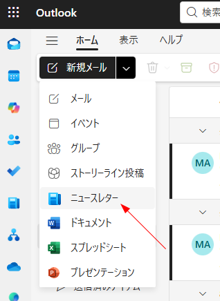 Outlook でメールを開いて「新規メール」の横の下矢印をクリックするとその中に「ニュースレター」がありますね。また、