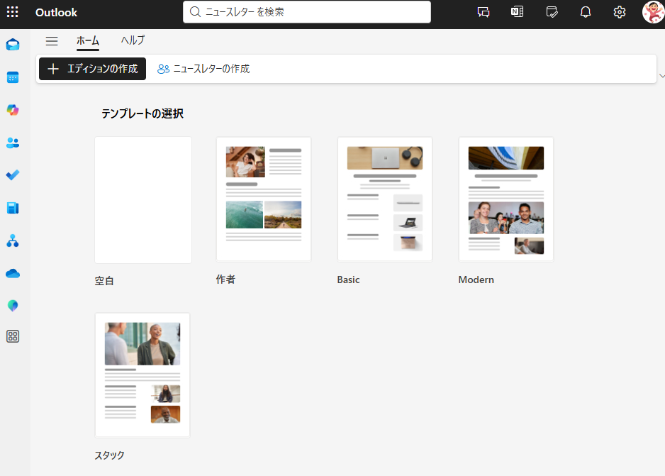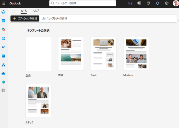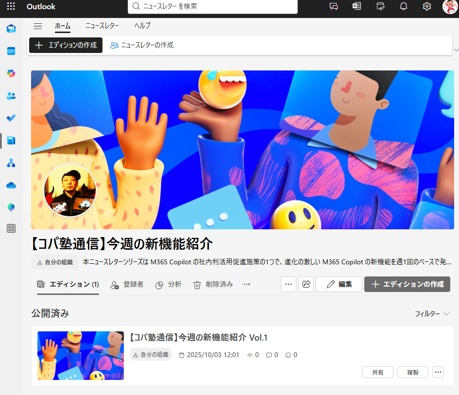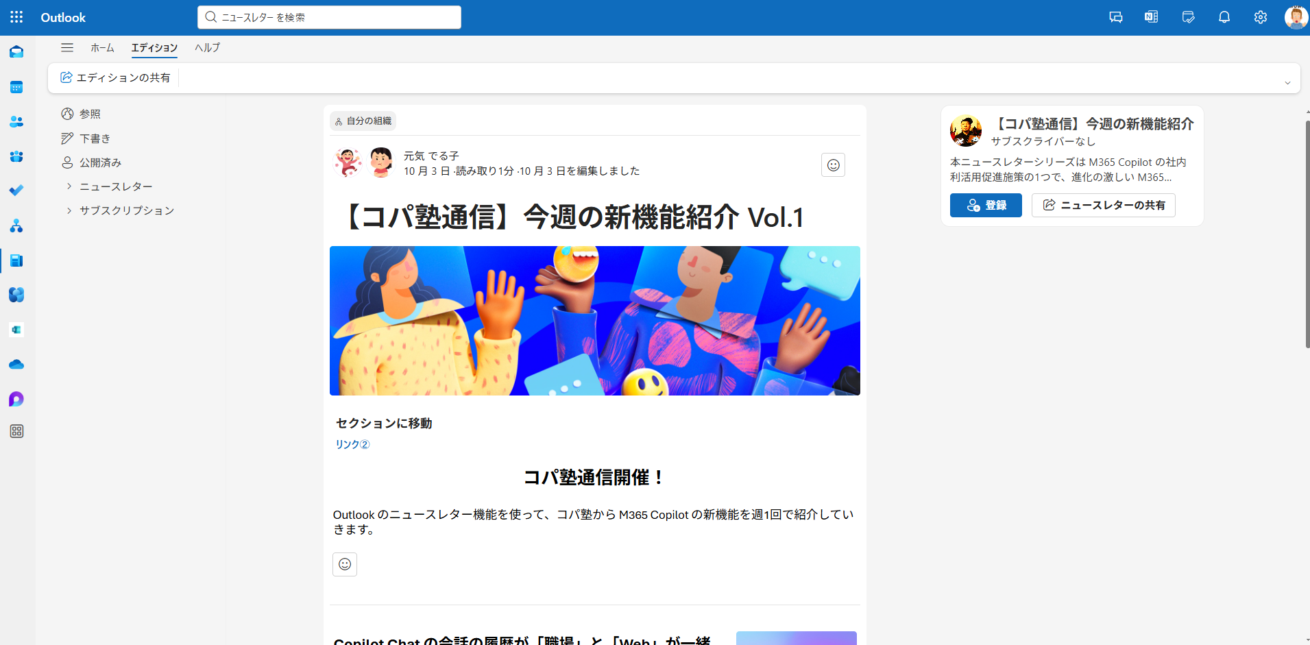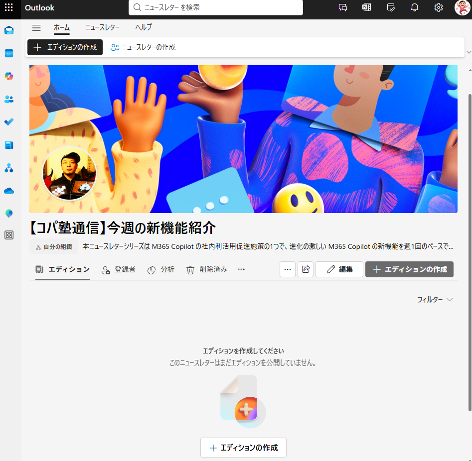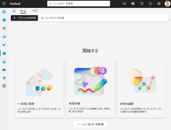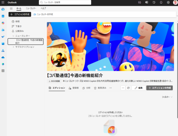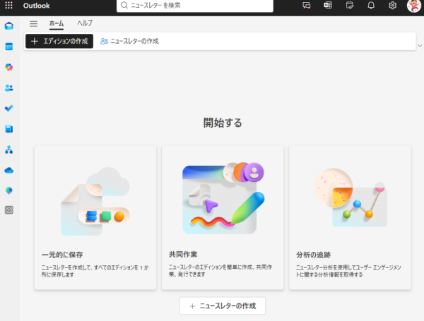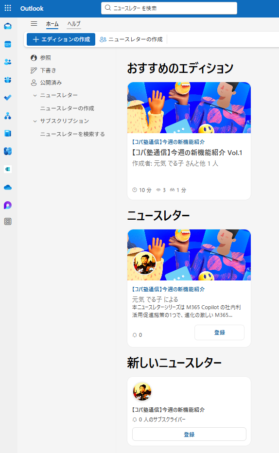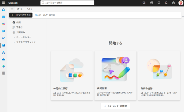 仕方ないので作成者2ユーザーと受信者1ユーザーとはまた別のユーザーで Outlook のニュースレターのホーム画面を開いてみます。
