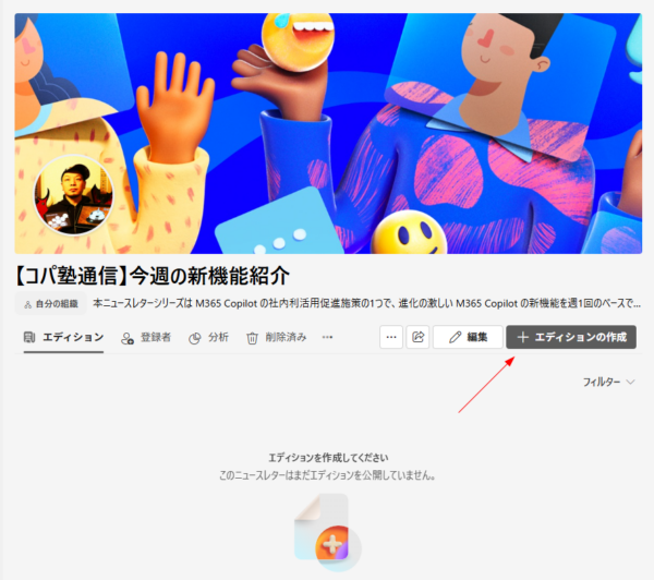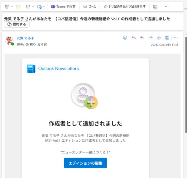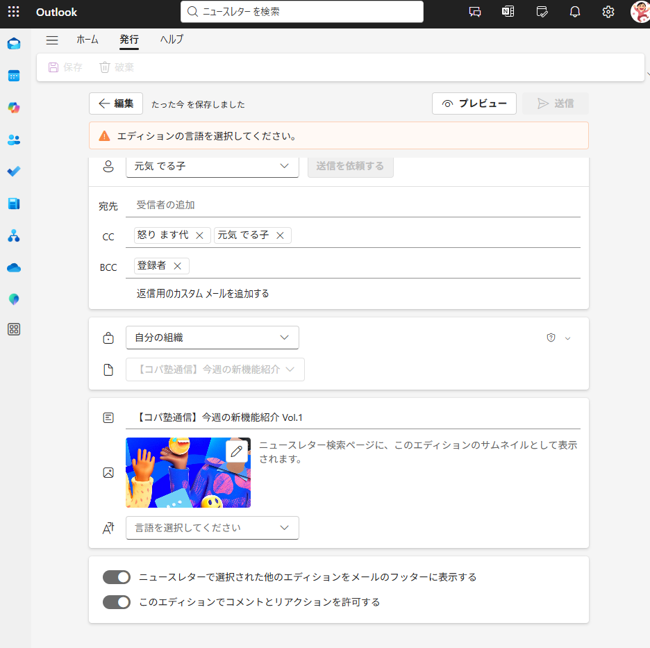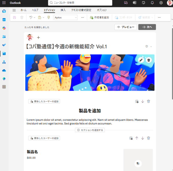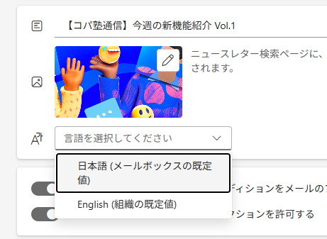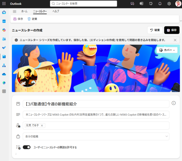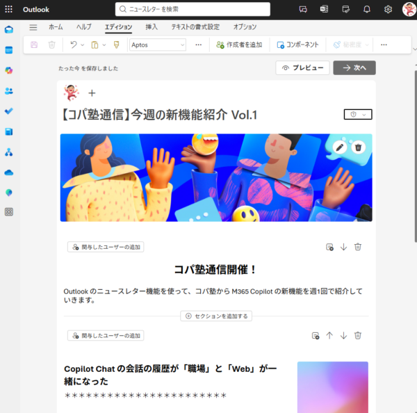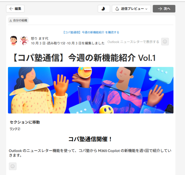 なんとなく SharePoint ニュースに似ていますね。でもなんとなくで同じではない。 SharePoint ニュースもメール送信できるので、使い分けも含めて考えるとUIも含めたUXは似ていた方が利用者の学習も減ると思うんですけどね。仕方ない。