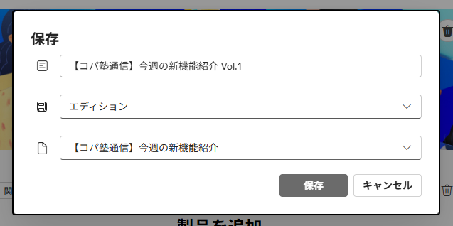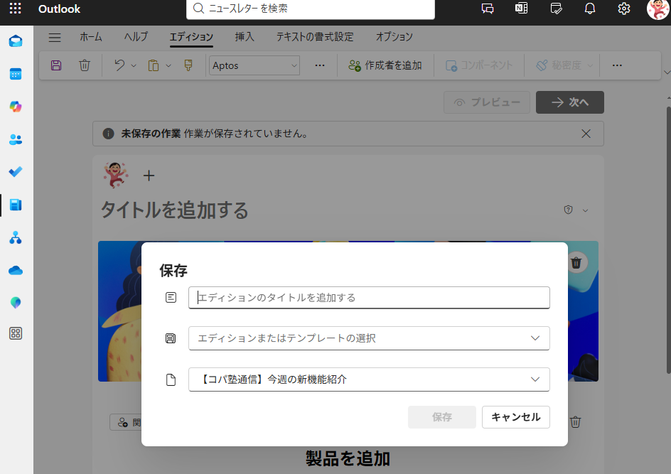 これがニュースレターとして発信されるわけじゃない!と思いつつ、「保存」をクリックしてみます。僕は検証環境があるので気にせずできますが、これ実環境だとドキドキしちゃいますよね。適当に試したら全従業員にメールが届いたりしたらと思うと怖いので。