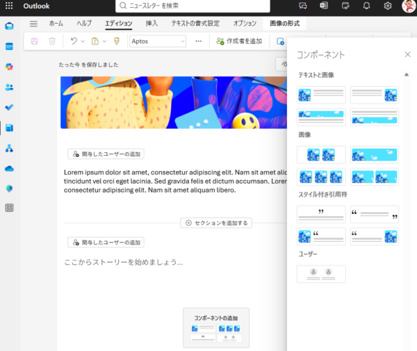なるほど、SharePoint ニュースで言うところのWebパーツみたいなものがありますね。でもやはりこれだけ見るとニュースレターは「テキスト」と「画像」でコンテンツを作り上げるようですね。