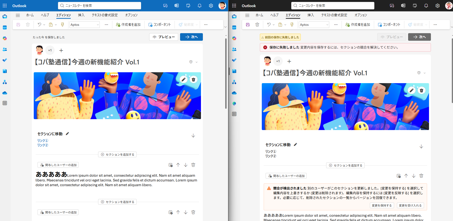 SharePoint ニュース・ページみたいに共同編集ができるようです。でも…ためしてみたところ SharePoint ニュース・ページほどはイケてないです。リアルタイム共同編集とまではいかず少し更新にラグがあったり、上のスクショのように競合が検出されたとかで変な感じになっています。もしかしたら共同編集はズラしてやった方が良いかもですね。今後どうなるかわからないけど。ここらへん SharePoint ニュースで成熟されているノウハウがあるなら流用すればイイのにって思うけど。