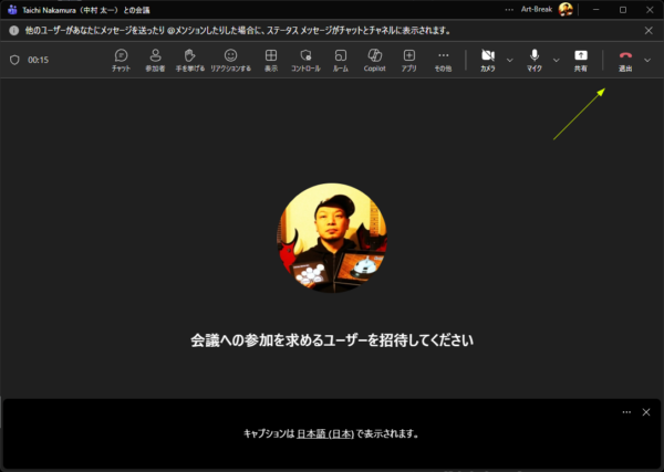 で、この状態で退出ボタンをクリックすると、会議から即退出します。今回は一人会議なので会議が終了されて会議ウィンドウが消えました。