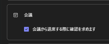 この「会議」に「会議から退席する際に確認を求めます」という設定項目があります。しかもデフォルトではチェックされていない状態です。なのでここを見つけない限りは気が付きにくいですね。