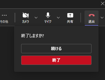 これですね。本当に終了するか?と確認を求めます。退出ボタン1クリックで退出させない事によって誤操作などによる間違えて退出させる事を防ぎます。ここで「続ける」をクリックすれば、ただこの吹き出しボックスが消えて、「終了」をクリックすれば会議が終了されます。