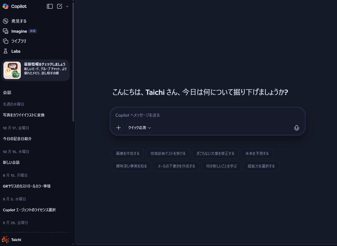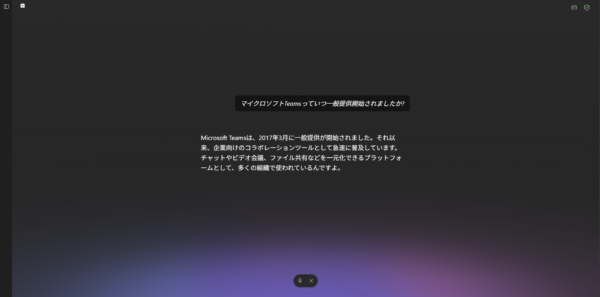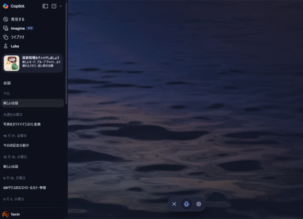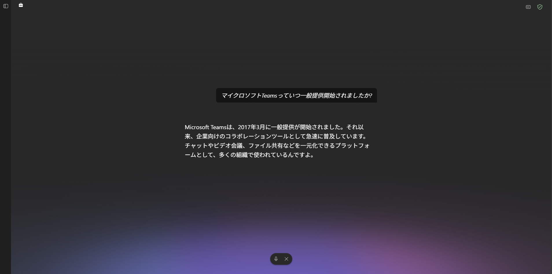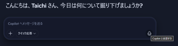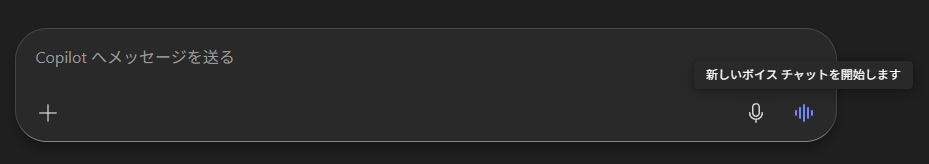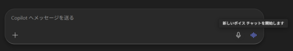 このようにこっちでは右下のマイクのアイコンが「 Copilot と会話する」というボイスチャット機能のボタンです。クリックすると、