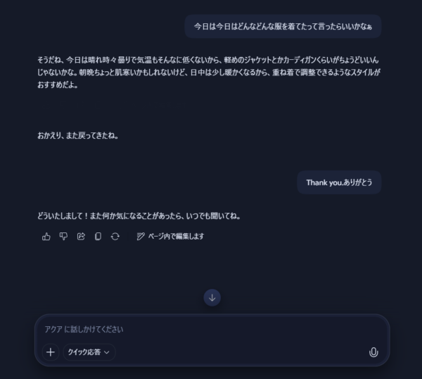 個人コパ使った後にこっちも使ったので違いが色々見えてきたけど、まず個人コパはボイスチャットを開始するとあっちから話しかけてきたけど、こっちのボイスチャットはこちらから話しかける感じでした。またこっちはこのように会話中に音声だけじゃなくテキストも表示してくれます。それはこっちの方がありがたいです。タイミング的にはこっちの音声はリアルタイムには拾ってくれるわけじゃなく、話し終えるとワンテンポ遅れて質問と回答がテキストに表示され、回答のテキストを音声が読み上げるような流れです。それでも個人コパの場合は音声だけなので外から雑音があったりすると聞き取れなくて困りますが、こっちの方は先にテキストが出てくるので目と耳でしっかり補完し合えます。