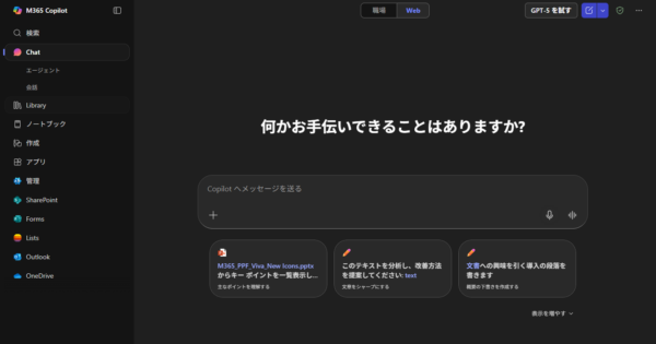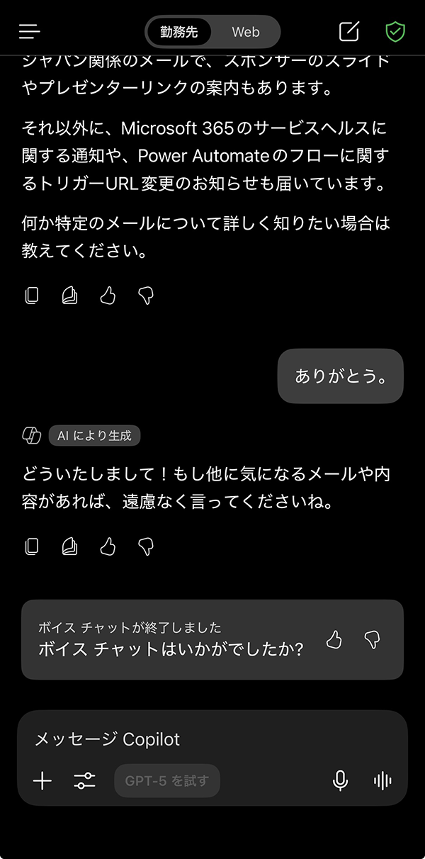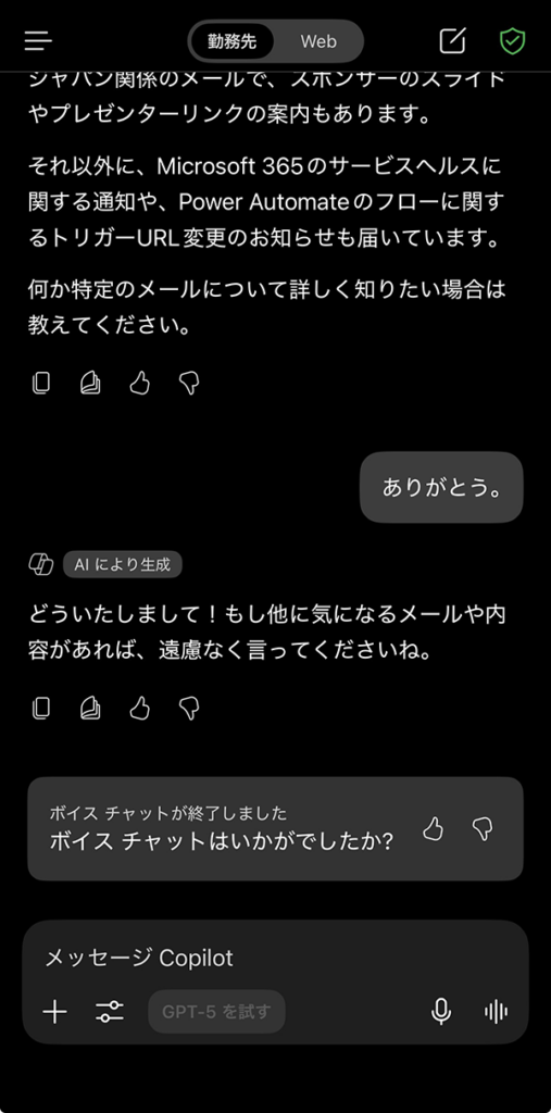 さて、ここでUXの一貫性という点では指摘事項がありますよね。個人コパだとマイクのアイコンがボイスチャットのボタンだったのに、 M365 Copilot Chat ではマイクのアイコンはディクテーションで、その右の縦5本線のアイコンがボイスチャットのボタンなんです。これは両方利用する人にとってはややこしい。