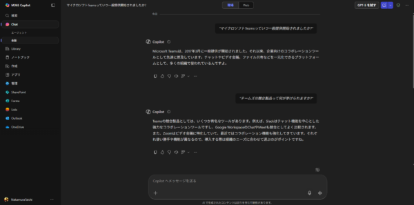 今回は見られたらモザイクかけたくないので当たり障りのない会話をしましたが、「職場」にした状態なら当然社内の情報についてもしっかり対象としてくれるので、音声会話でもっと社内の突っ込んだ会話ができますね。