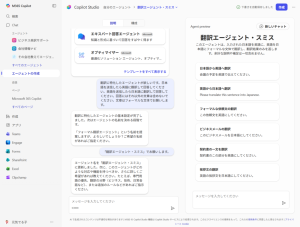 もちろん M365 ライセンスの範囲内なのでWebグラウンディングしかできないエージェントしか作れませんけどね。また有償版の Copilot Studio に比べるとかなり限定的なことしかできませんが。それでもこのスクショのように自分の好みや利用シーンに特化した翻訳エージェントとか、Web上の調べ物を助けてもらうためのエージェントなどであれば便利に使えると思います。他によく聞く利用シーンは、営業さんが営業前に顧客情報を調べるために会社情報を自分が欲しい情報のみをピックアップして探してくれるエージェントとか。その回答が正しいかどうかは知りませんよ。