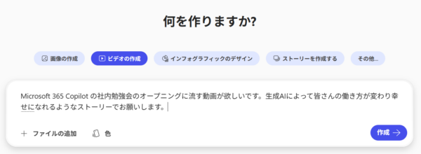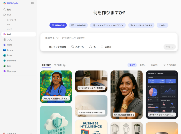 英語だと「 Copilot Create 」でカッコイイのに日本語UIだと「作成」なのでダサかったりしますが…。ココは今年の前半までは以前からもできていた Word / Excel / PowerPoint を作り始めるランディングページみたいな位置付けで、他にもテンプレートを探したりするような事ができていました。で、当時は Microsoft 365 Copilot ライセンスもあるユーザーであれば、画像生成や動画生成もできていて大きな差がありました。しかし、今年の後半に Copilot Create も M365 ライセンスのみのユーザーも機能拡張し、画像生成や動画生成もできるようになっています。