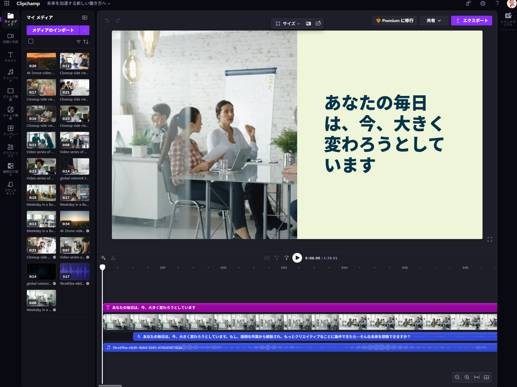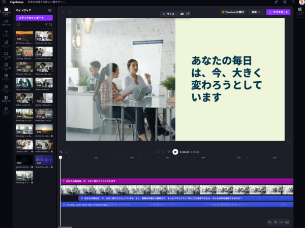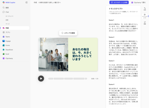 凄いのは画像と同じく生成してくれた動画を人間が編集する事もできます。 Microsoft 365 には Clipchamp という動画編集アプリがありますからね。 Copilot が作ってくれた動画を Clipchamp で開いて人間が編集できるという仕組みです。