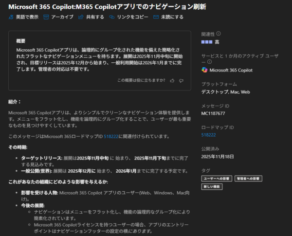 2025/11/18 付けで Microsoft 365 管理センターのメッセージセンターに、以下のメッセージが公開されました。
