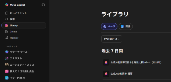このように Copilot ページは「 Library 」に移動してクリックしないと確認できなくなっています。急にナビゲーションから消えてしまったので戸惑う人もいるでしょう。 Copilot ページを利用している人は。