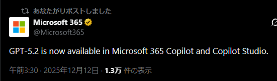 つい最近 GPT-5 が既定になったのに、 GPT-5.2 の発表が OpenAI から発信された直後に、またまたスピード対応でした。