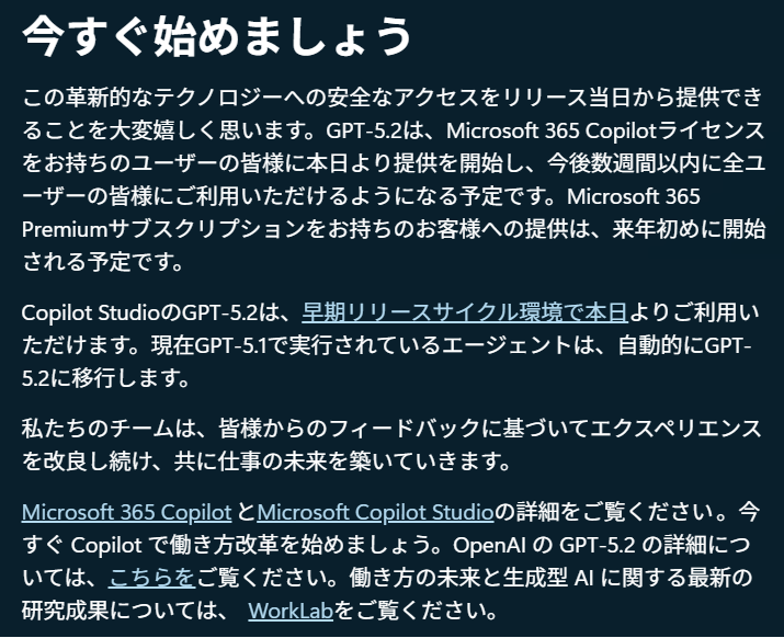 僕は生成AI全般は詳しくないけど、 GPT-5 から Microsoft は OpenAI が新しいモデルを出すとすぐに Copilot にも反映してくれますね。
