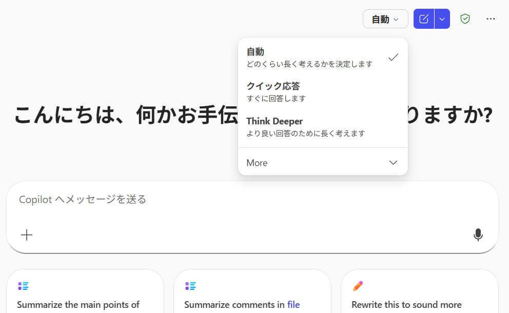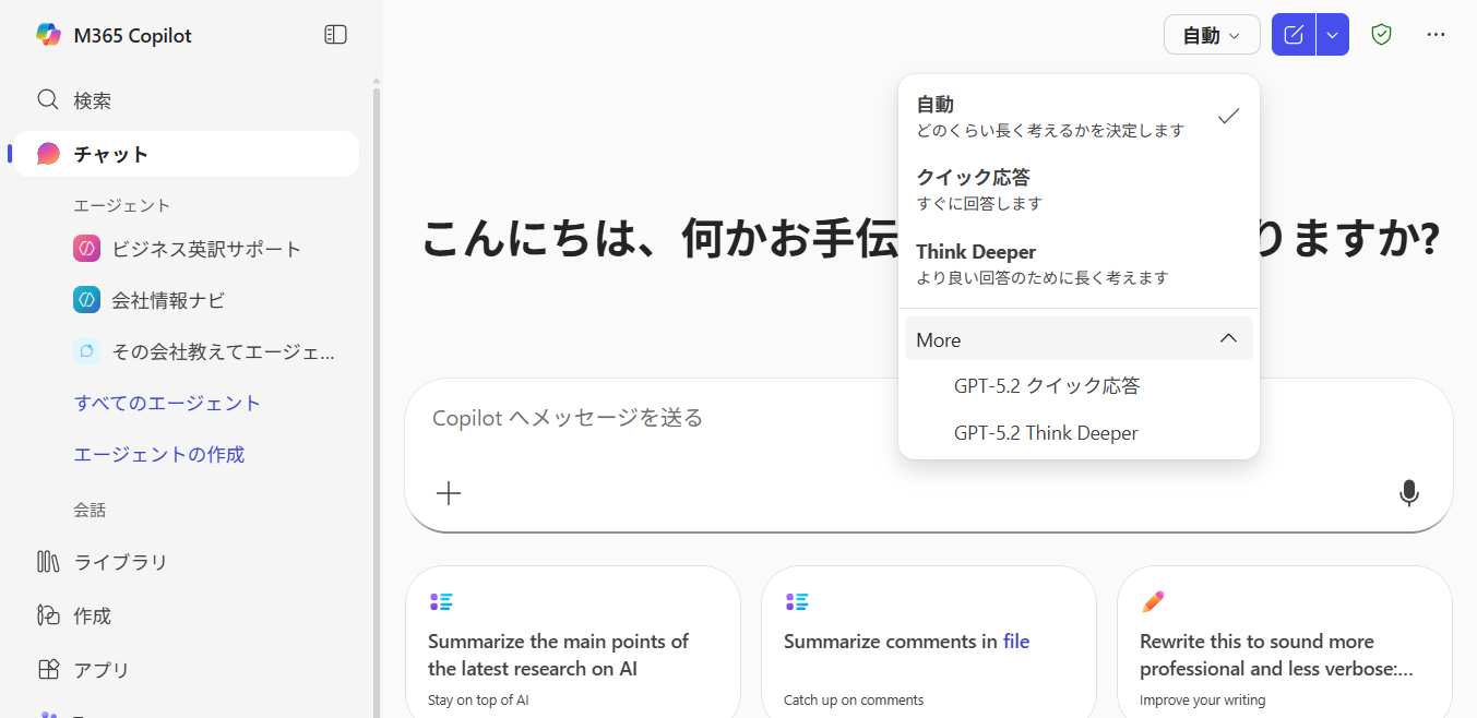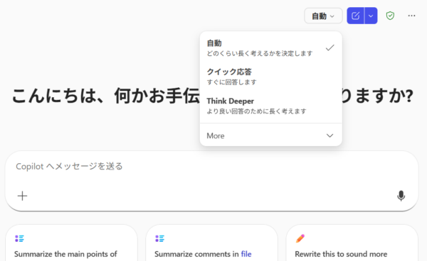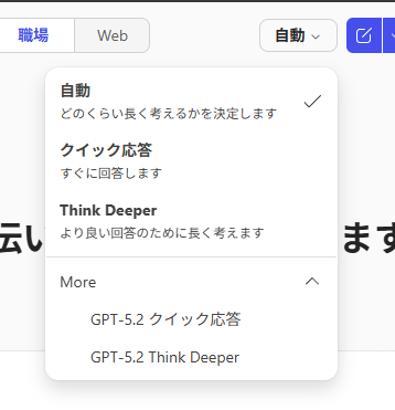 で、 GPT-5 であれば「自動」があるので Copilot にお任せができるけど、 GPT-5.2 に関しては「 GPT-5.2 自動 」はないので、やってほしい事に応じてクイック応答か Think Deeper かを選択しないといけませんね。