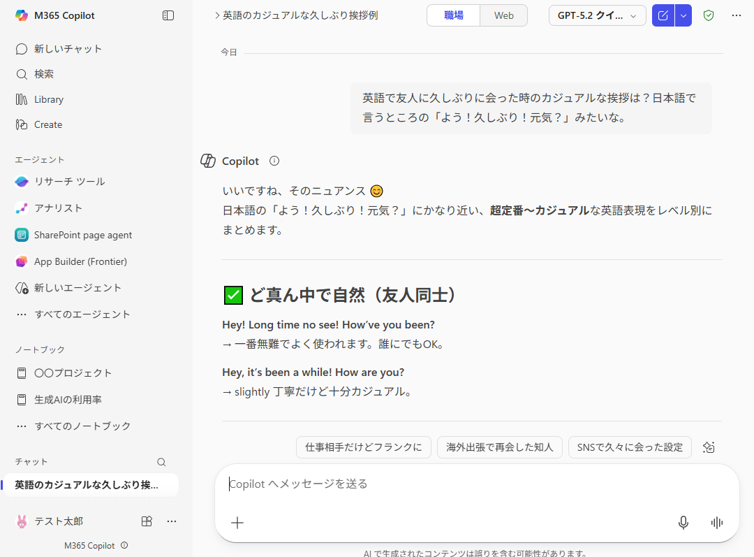 クイック応答を試したけど、体感的によりクイックだった(気がする)。あとちょっと試したところ、回答の言葉遣いがまるで同僚みたいな親しみやすいというか機械っぽくない言い回しが使われている(気がする)と思いました。まぁ、僕はさっきも書いた通り生成AI全般は詳しくないので、どのモデルがどうだみたいな生成AIソムリエではないので、僕の生成AI舌は鈍感だからあてになりませんけどね。