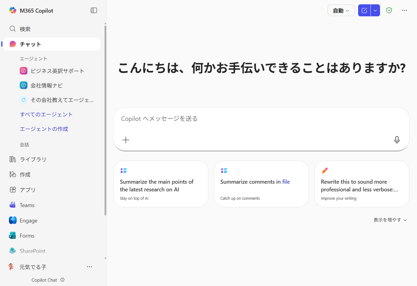 見ての通り、上部中央に「職場/Web」のボタンがないし、左下には「 Copilot Chat 」って書いてあるのが M365 ライセンスのみの証拠です。で「自動」をクリックすると、