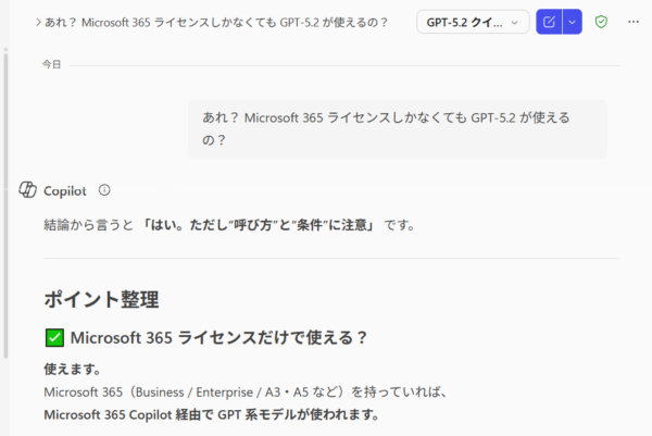 ここで「 GPT-5.2 クイック応答」か「 GPT-5.2 Think Deeper 」を選択できます。つまり、先日 GPT-5 が既定になる前の状態の時も GPT-5 はボタンをクリックして意図的にオンにしないと使えなかったけど、同じように Copilot Chat で使える最新モデルは意図的に選択するという感じですね。もしかしたら今後もこんな感じになるのかもしれないですね。