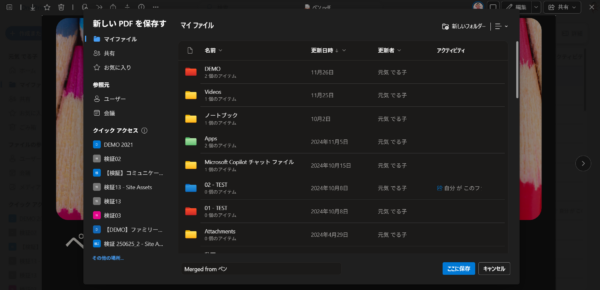 「抽出」の時と同じく、 ODfB だけじゃなくクイックアクセスの SharePoint ライブラリも選択できます。