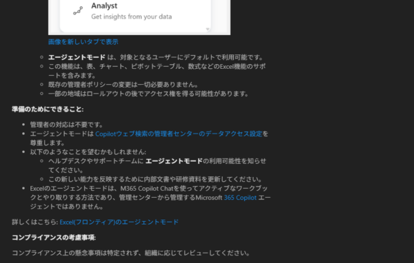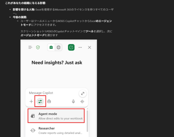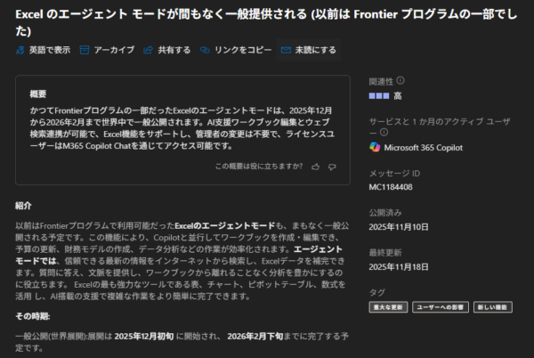 それからおよそ2か月を経て、冒頭で紹介したリンク先の記事の通り、 Excel のエージェントモードが一般提供開始されたんです。 2025/11/10 付けで Microsoft 365 管理センターのメッセージセンターにも、以下のメッセージが公開されました。