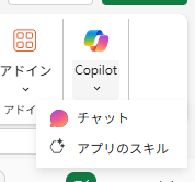 その状態で Excel の Copilot Chat を開きました。注意点があります。 Excel の Copilot Chat はちょっと特殊で Copilot ボタンの下に矢印ボタンがあり、それをクリックすると選択肢があります。