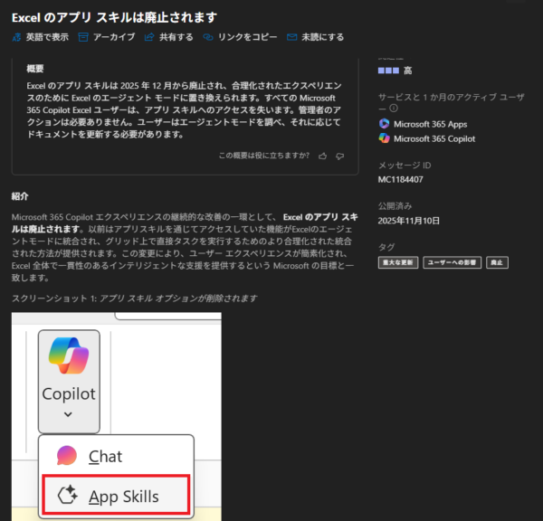この「アプリのスキル」ってのがこれまでは希望の星というか Excel に特化したスキルがあるみたいなものですが、正直僕はこっちを使っても残念コパでした。ちなみにこのアプリスキルは Excel のエージェントモードが出てくる事で今年2025年12月から2026年2月の間に廃止される事が予定されています。該当するメッセージセンターのメッセージは以下。