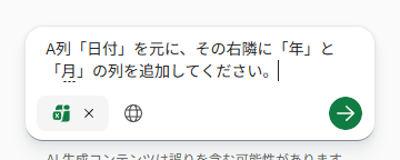 ここから試してみるのが、例えばA列の「日付」を元に隣に「年」と「月」の列を追加してもらいましょうかね。